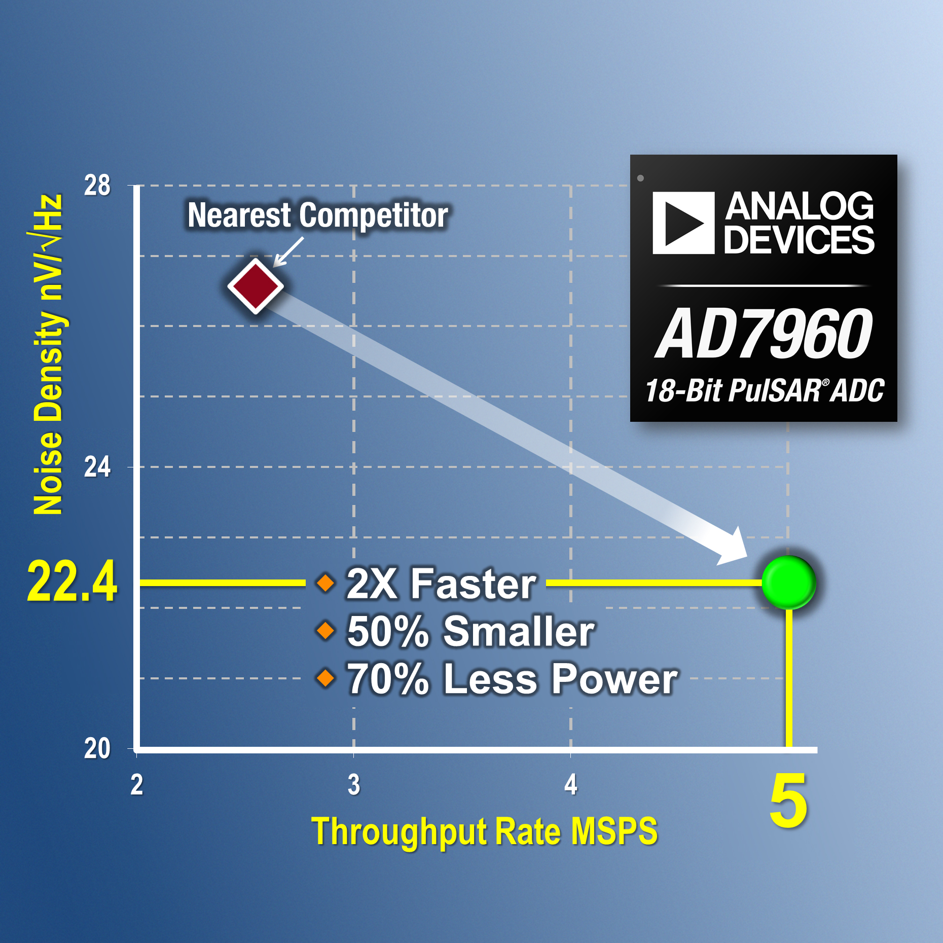 Společnost Analog Devices představila 18bitový A/D převodník PulSAR® s vzorkovací rychlostí 5 MS/s, což je dvojnásobná rychlost v porovnání s rychlostí kteréhokoli jiného AD převodníku SAR (Successive-Approximation Register). S touto v průmyslu doposud nevídanou rychlostí, ve své třídě nejnižším šumovým pozadím a vysokou linearitou je A/D převodník PulSAR AD7960 navržen pro použití v aplikacích, kde je důležitá nízká spotřeba, v multiplexovaných systémech jako jsou např. digitální rentgeny, aplikace s převzorkováním včetně spektroskopie, řízení gradientu MRI (Magnetic Resonance Imaging) a plynová chromatografie.